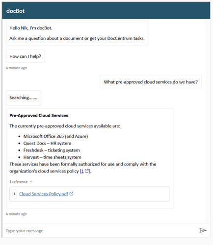 docBot gives organisations an Artificial Intelligence -powered way to surface policies, procedures and mandatory reads instantly, directly within Microsoft 365. Customers benefit from faster answers, reduced time spent searching, and improved compliance because responses are traceable to authoritative sources. By integrating with docCentrum, docBot turns static content into actionable knowledge—helping teams stay informed, complete tasks in context, and meet governance requirements without leaving their workflow.